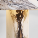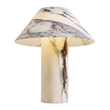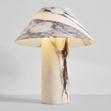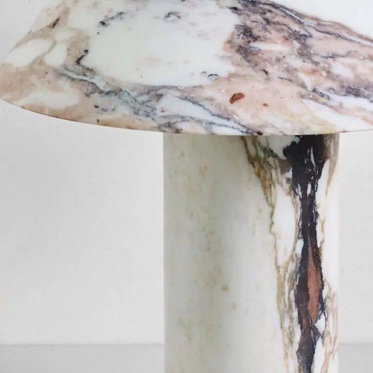Äkta Sten: Tillverkad helt i naturlig marmor, där både fot och skärm har unika ådringar som skapar ett levande mönster när ljuset är tänt.