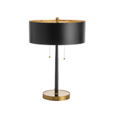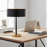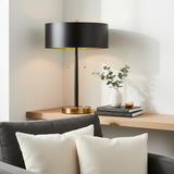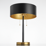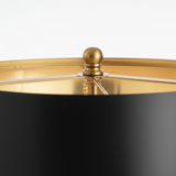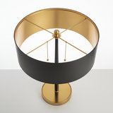 Elegant Kontrast: Den djupa, mattsvarta cylinderskärmen skapar en dramatisk kontrast mot den reflekterande guldinsidan, vilket ger ett varmt och rikt sken.