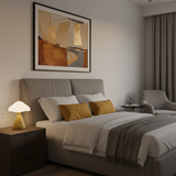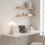 Naturlig Skönhet: Den koniska foten i trä möter den mjukt kurvade, vita skärmen i en design som hyllar naturens elegans.